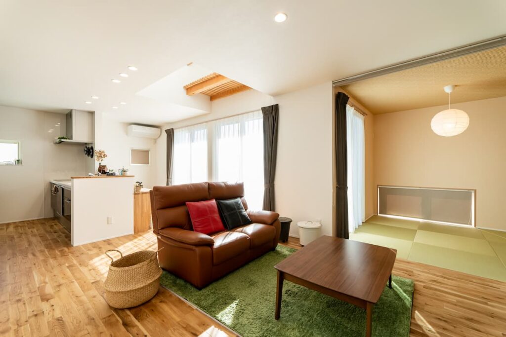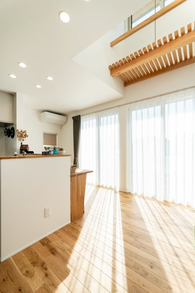 大きな窓からは太陽光がたっぷりと差し込み、家族が集う空間を明るく照らします。