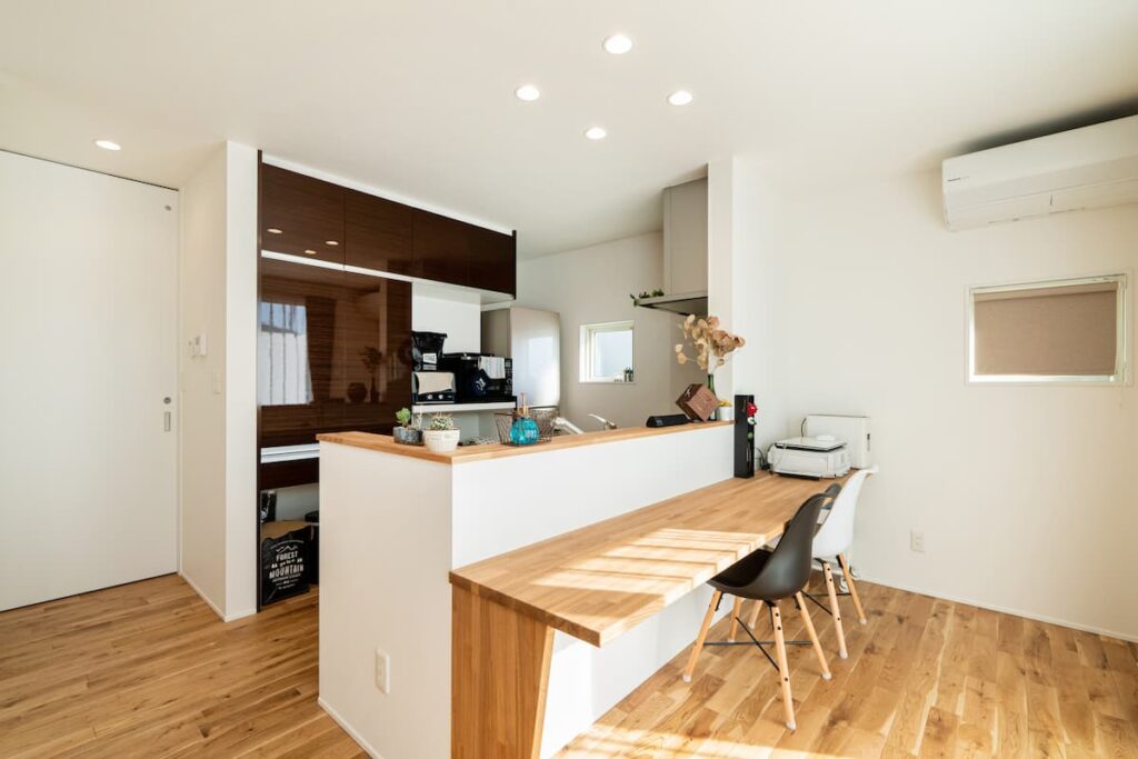 キッチンは対面型でカウンターを設け、家族と会話を楽しみながら料理が可能です。