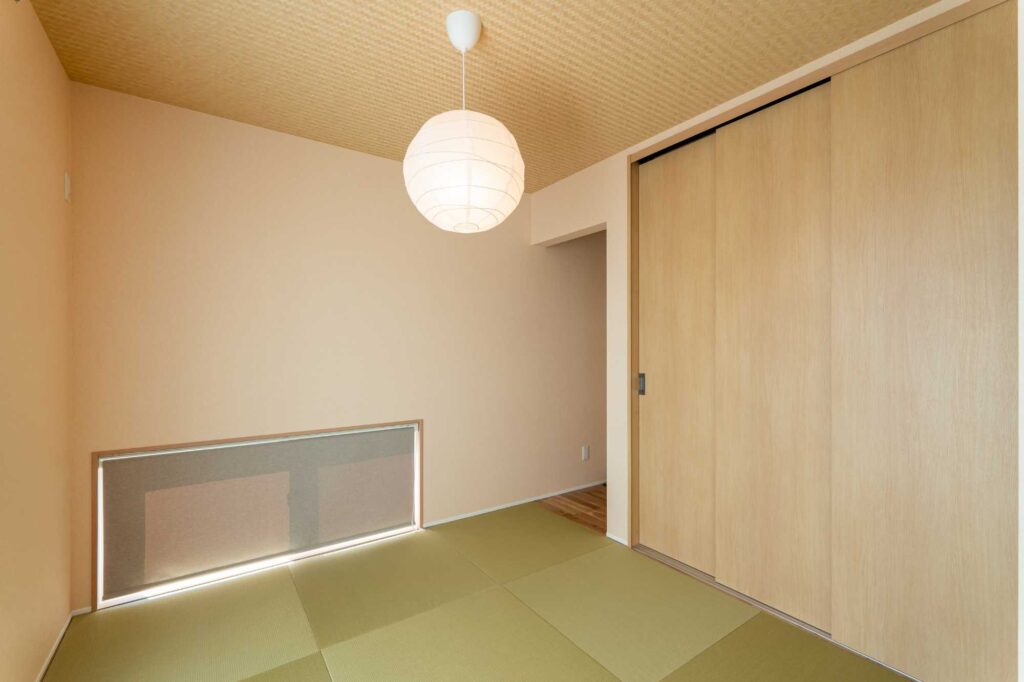 リビングとつながる和室は、家族の時間を柔らかく包み込む空間。リビングとの間にロールカーテンを設置することで、必要に応じてプライバシーも確保できます。収納もたっぷりと用意され、使いやすさと開放感を両立。張り出した和室は道路からの目隠しにもなり、落ち着いて過ごせる空間になっています。