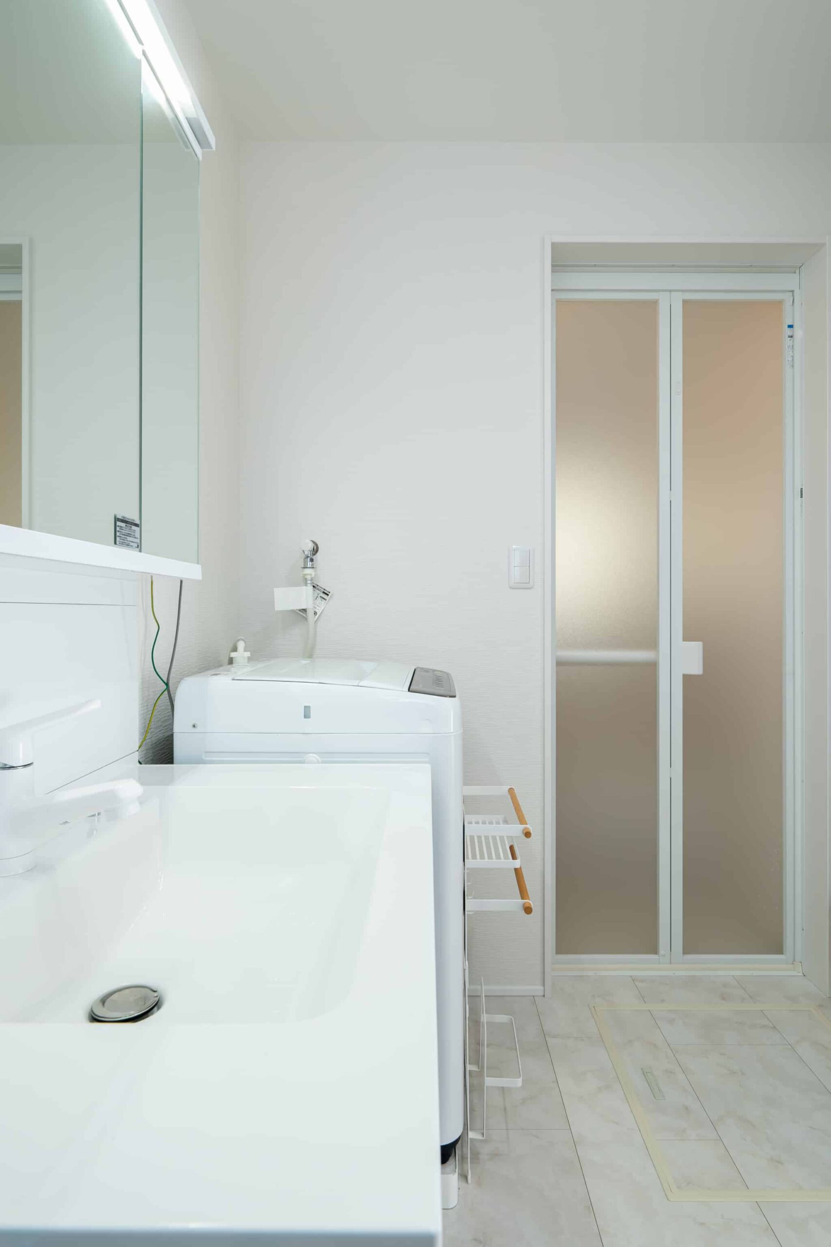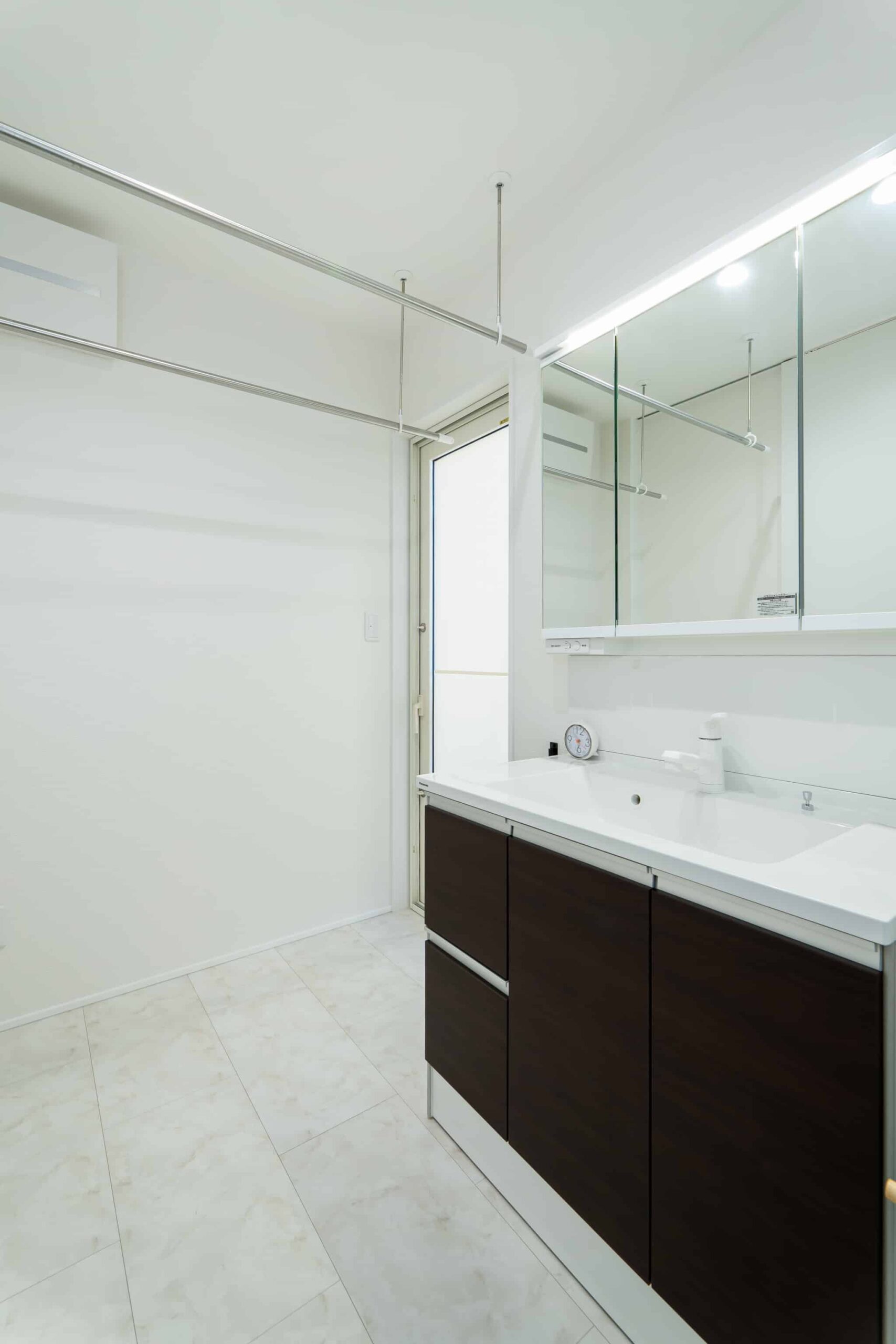 洗面台には、収納を兼ね備えた3つの鏡を配置。家族が順番を気にせず、同時に使える設計です。広々としたランドリールームには物干し竿を設置し、室内干しも可能となっています。