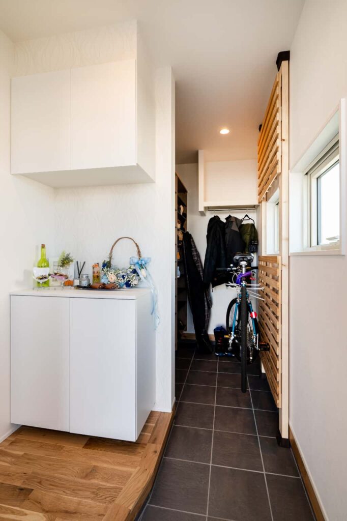 玄関を開けた瞬間から、趣味や日常が自然に調和する工夫が随所に施されています。
