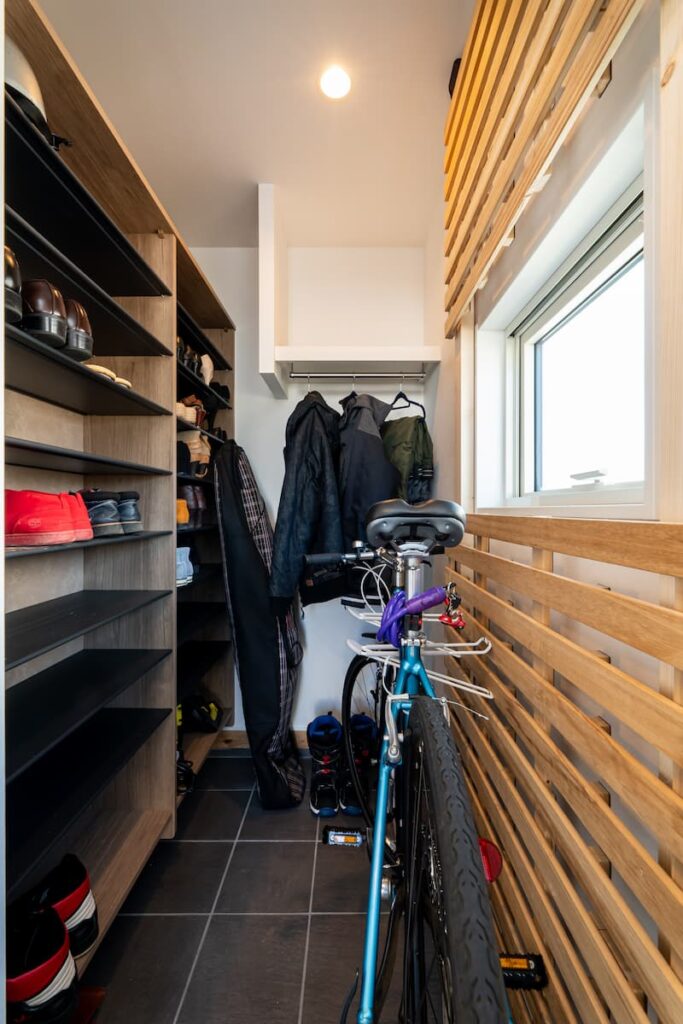 玄関横の収納には、靴がたっぷり入る棚に加え、上着をかけられるスペースも確保。ご主人の趣味であるロードバイクは、浮かせて収納できる工夫が施されています。