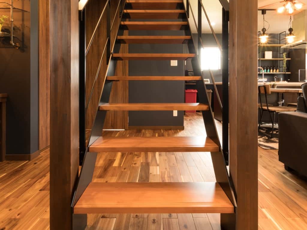 アイアンの手すりが空間を引き締めるスケルトン階段。それを上るとフリースペースの窓から光がいっぱい差し込みます。