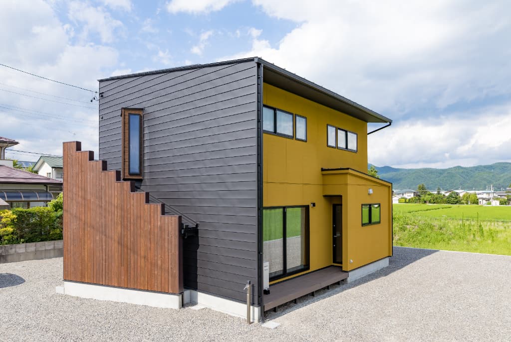 外観はマスタードとネイビーを組み合わせた個性的なデザイン。屋根には太陽光パネルを搭載し、ランニングコストの低減を実現しています。