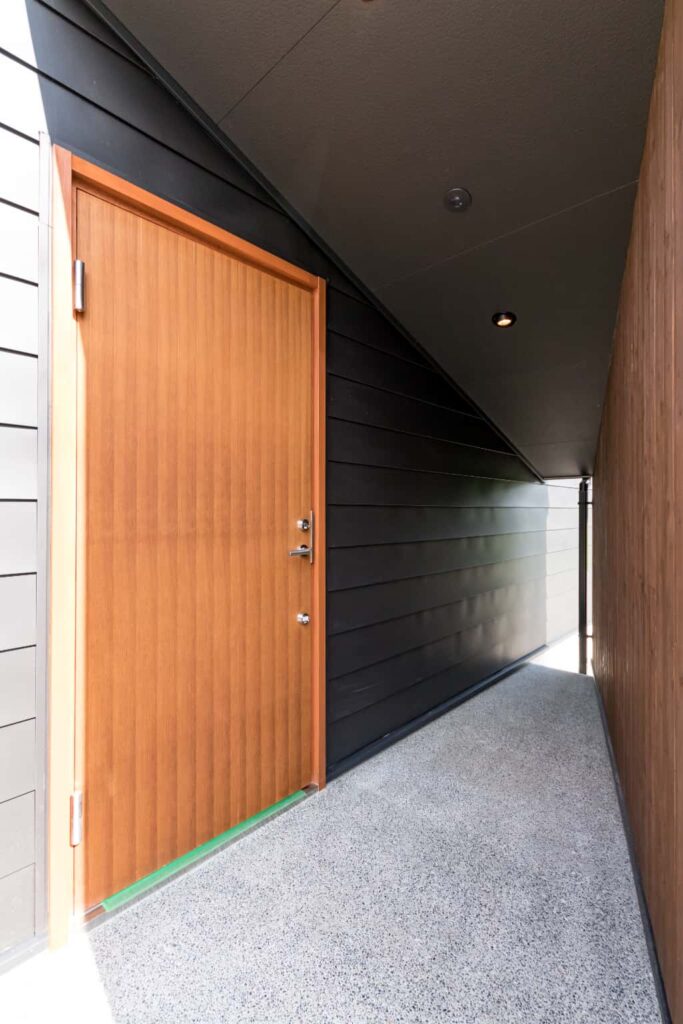 玄関前には信州産カラマツを用いた木製アクセントを配置。表面はあえて木肌の荒々しさを生かした仕上がりに。