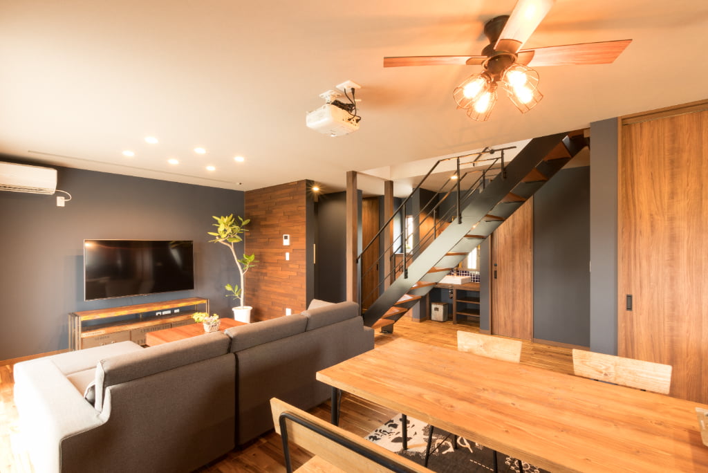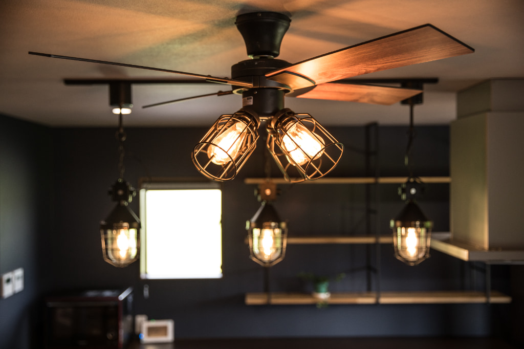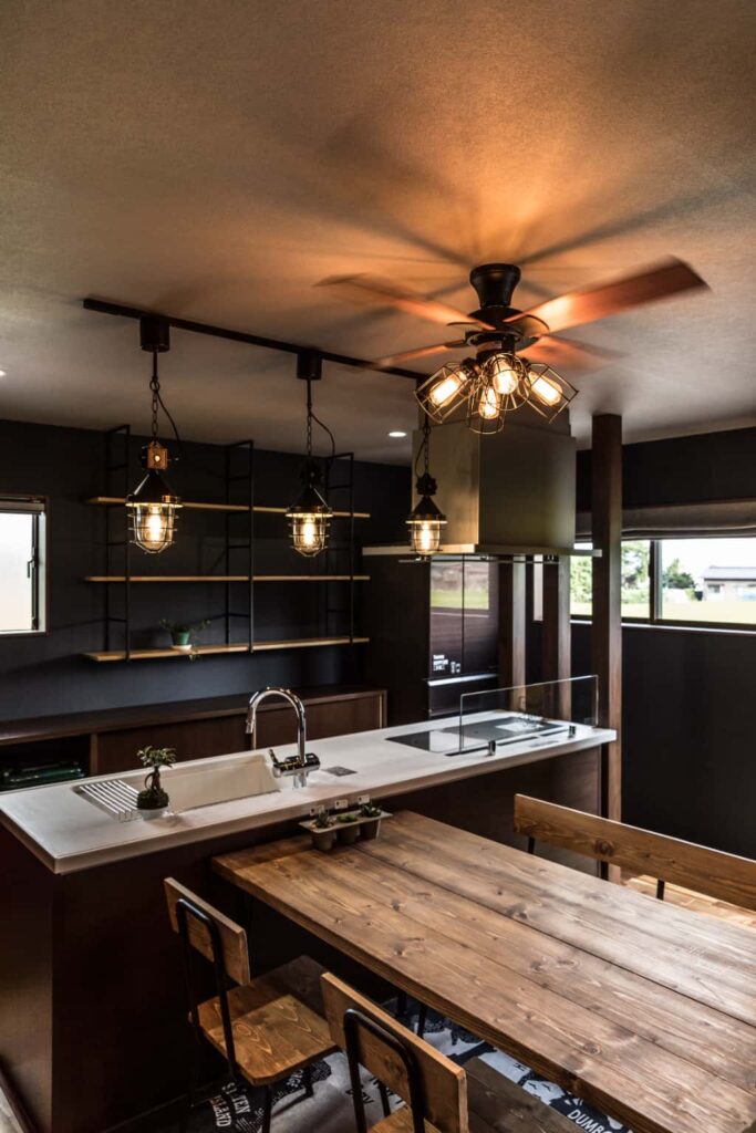 ダイニングの天井にはシーリングファンを設置し、クールな雰囲気を演出します。