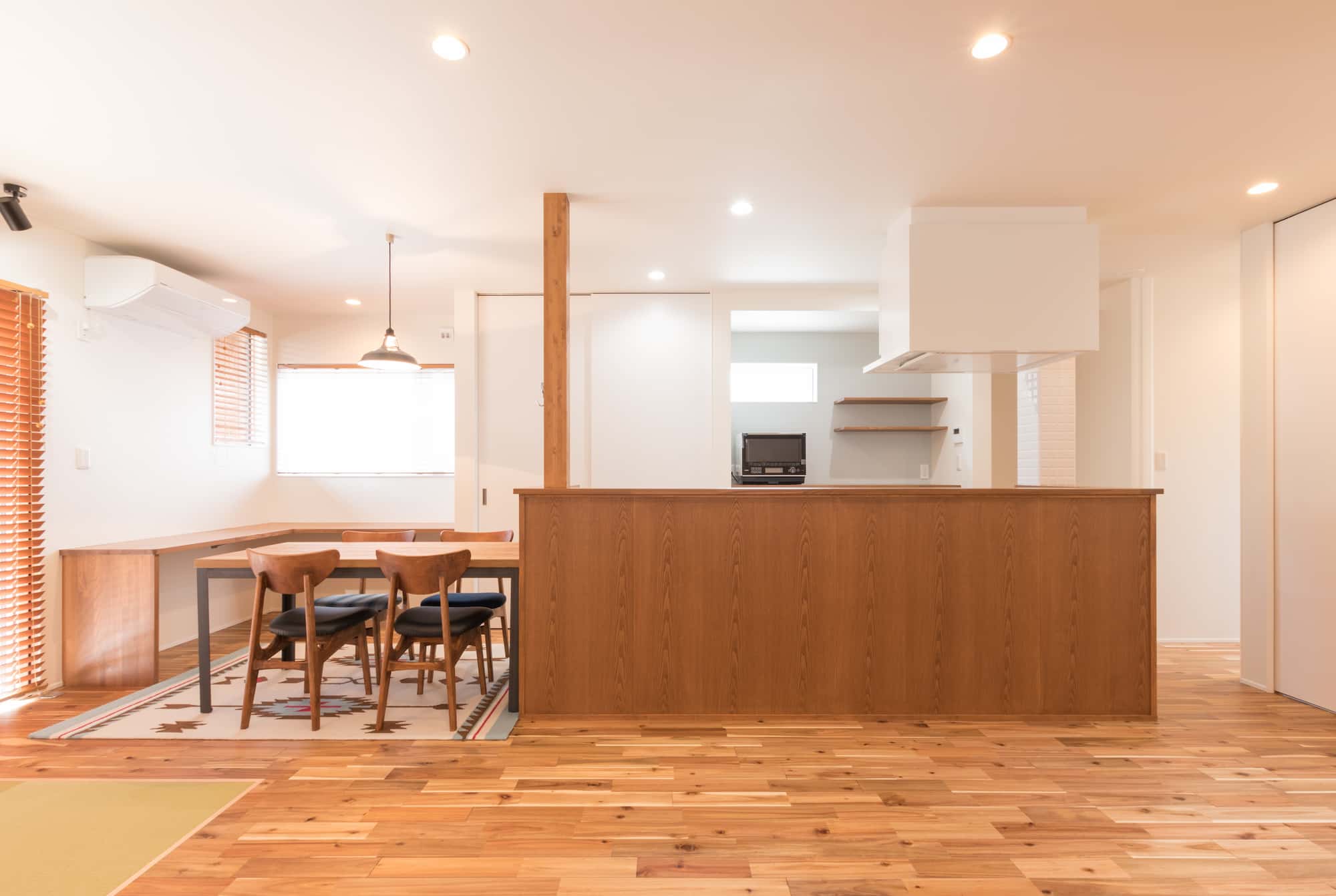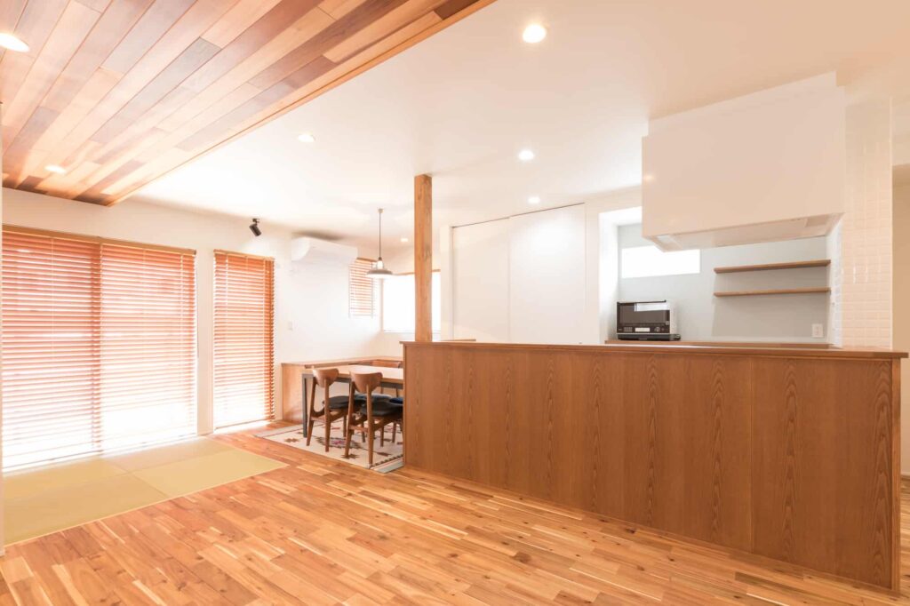 LDKは白い壁にアカシアの床を組み合わせ、広々とした温かみのある空間に仕上げました。外側を木目で仕上げたキッチンカウンターや木製ブラインド、天井の板張りをアクセントに。