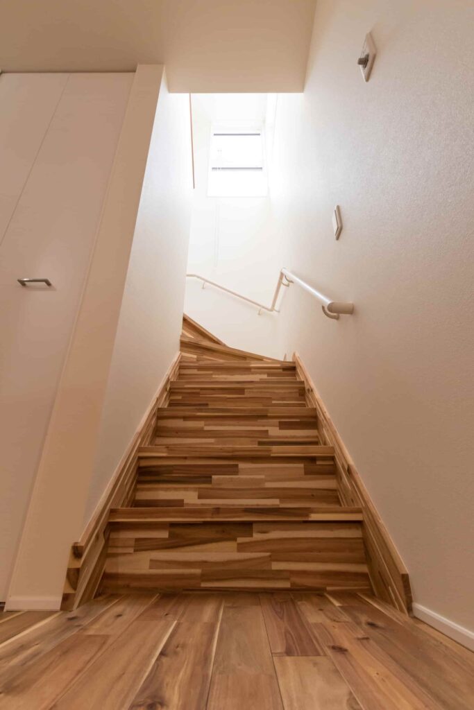 階段にもアカシア材を使用し、自然の濃淡や木目の表情を生かした仕上がりに。住まい全体で木の魅力を感じられる、温かみあふれる空間となっています。